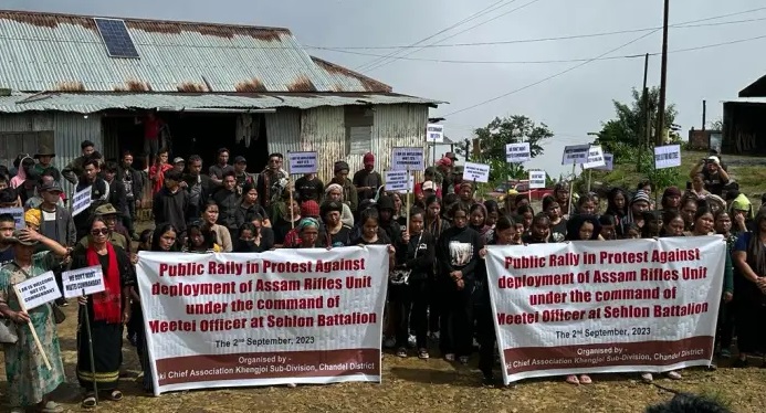 Dingpi area under Khengjoi Sub-Division in Chandel district on September 2, 2023 protested against the proposed deployment of Assam Rifles Unit under the command of a Meitei officer at Sehlon, Chandel district.
