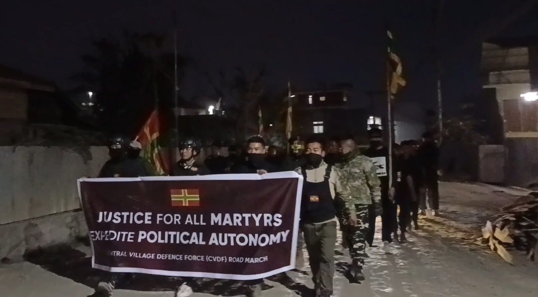Demanding justice for Thanlon MLA Vungzagin Valte and all Kuki Zomi Hmar martyrs of Manipur conflict, Central Village Defence Force organise road march in Churachandpur district of Manipur on Friday evening.