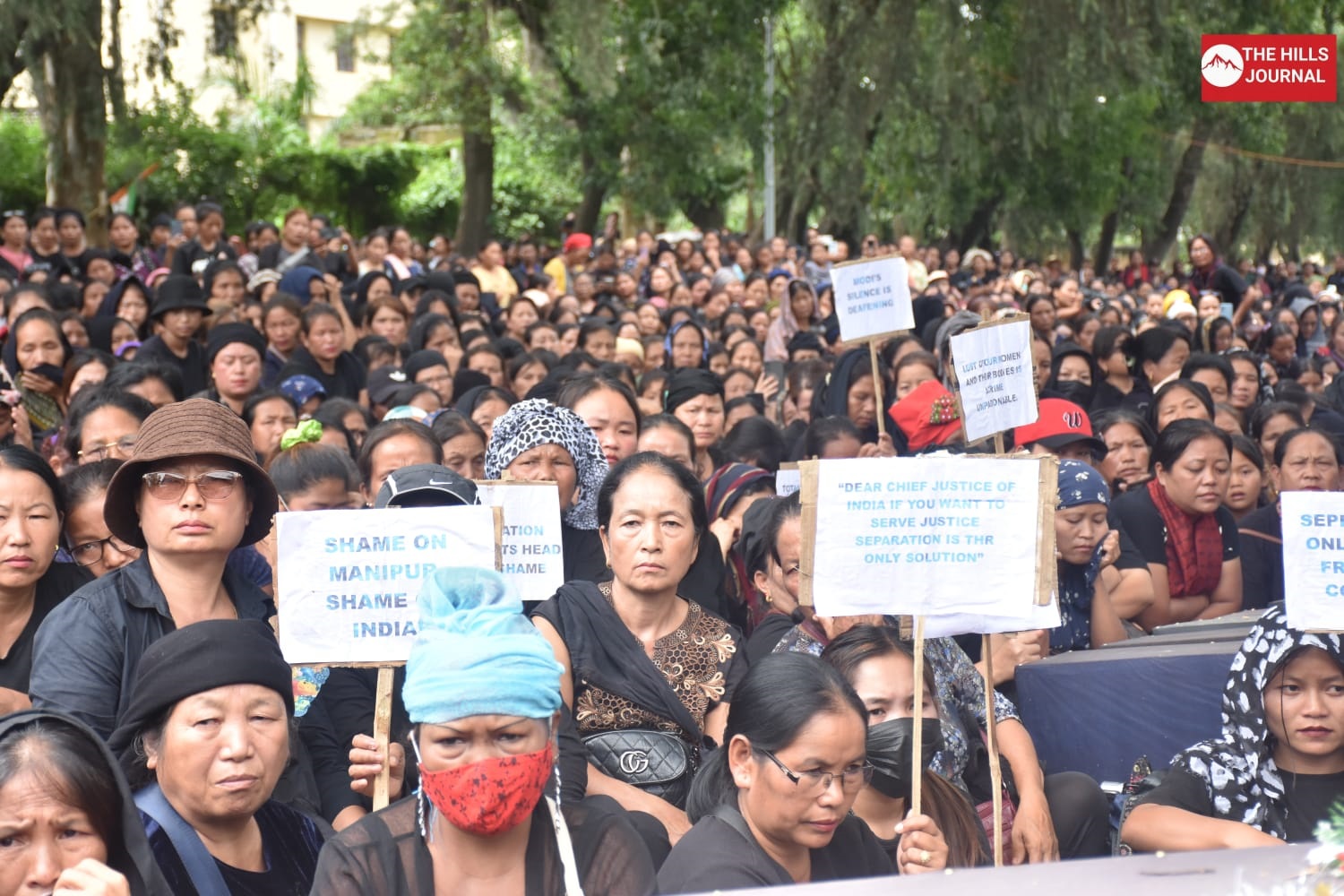 The womenfolk in black dresses were seen holding placards such as ‘ We can’t stay with Meiteis and still be human’, ‘ The nation hangs its head with shame’, ‘ Lust of our women and their bodies is a crime unpardonable’, Capital punishment for the rapists’, ‘Dignities killed but souls intake.’