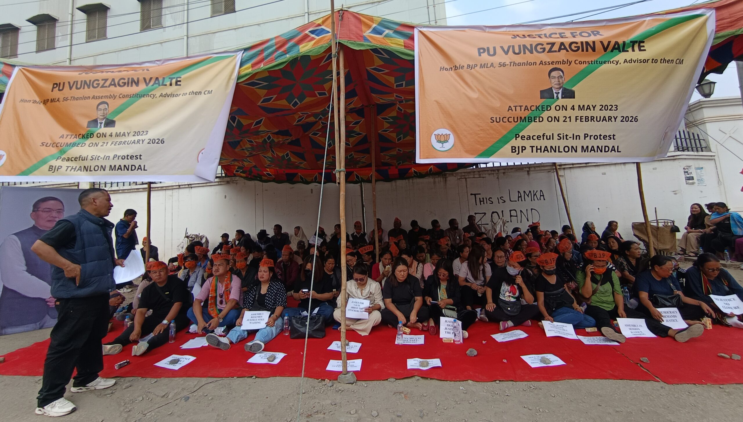 Demanding justice for late Manipur BJP MLA from Thanlon assembly constituency in Churachandpur district of Manipur, Vungzagin Valte, BJP Thanlon Mandal holds peaceful sit in protest near Churachandpur Medical College gate on Monday.