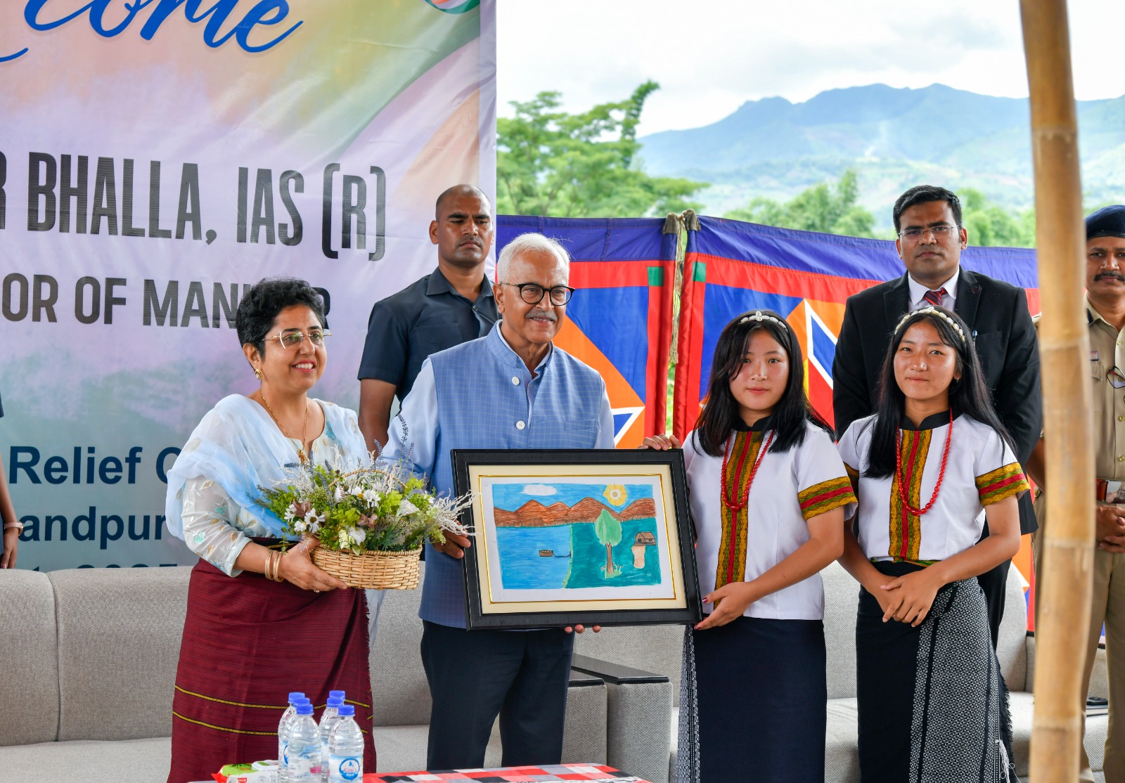 Governor Bhalla also took the occasion to felicitate two girls from Ngaloi Relief Camp, Nemneilhing and Hatneineng, who had successfully cleared the NEET examination. He personally interacted with the two students and shared a brief moment of encouragement. Chocolates were distributed to children at the camp, and food items, along with other essential supplies, were handed over for lactating mothers.