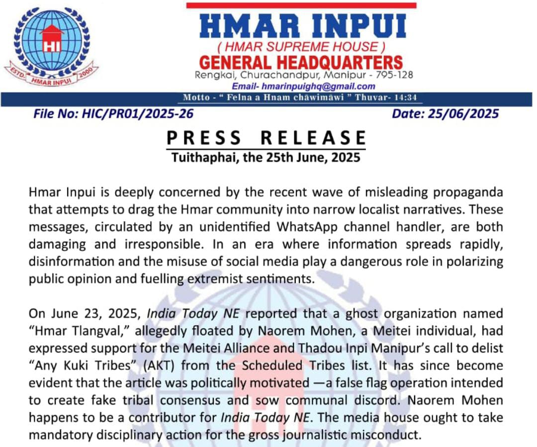 Apex body of Hmar tribe in Manipur, Hmar Inpui has slammed India Today NE and one of its news contributor for filing and publishing a news report based on a press release source from social media.