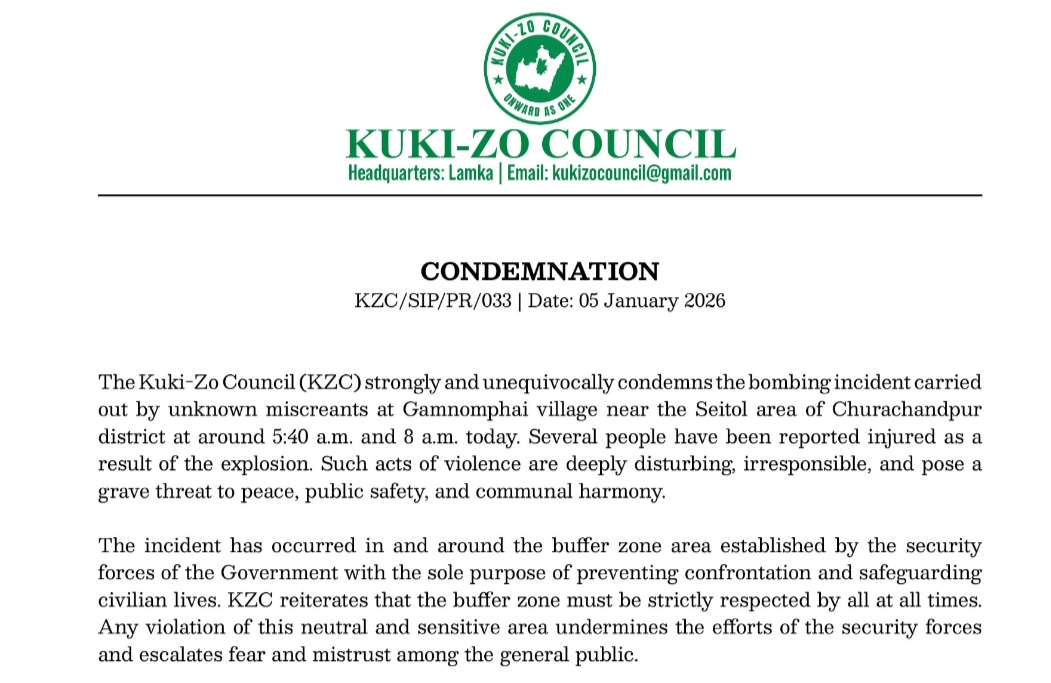 The Kuki-Zo Council (KZC) has unequivocally condemnsled the bombing incident carried out by unknown miscreants at Gamnomphai village near Seitol area of Churuchandpur district at around 5:40  to  8 in the morning today.