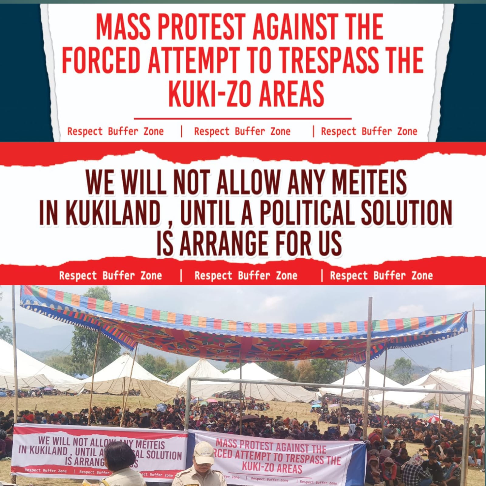 The protests were sparked by what the Kuki-Zo community described as repeated encroachment efforts under the guise of religious rituals. The demonstrators, holding placards reading “Go Back Meitei,” “Respect Buffer Zones,” and “Don’t Politicise Ching-Kaba,” condemned the move as an infringement on their land and identity.