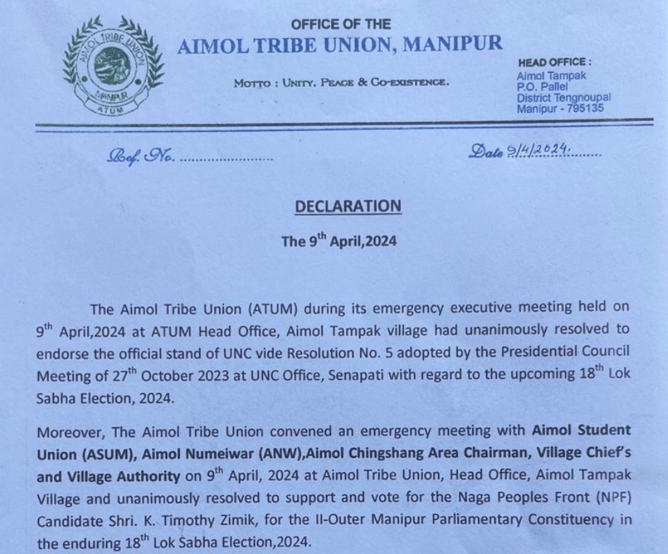 Moreover, the Aimol Tribe Union during its emergency meeting with Aimol Students' Union (ASUM), Aimol Numeiwar (ANW), Aimol Chingshang Area Chairmen, Village Chief's and village authorities unanimously resolved to support and vote for the Naga People's Front (NPF) Candidate K. Timothy Zimik, for the II-Outer Manipur Parliamentary Constituency in the ensuing 18th Lok Sabha Election, 2024.