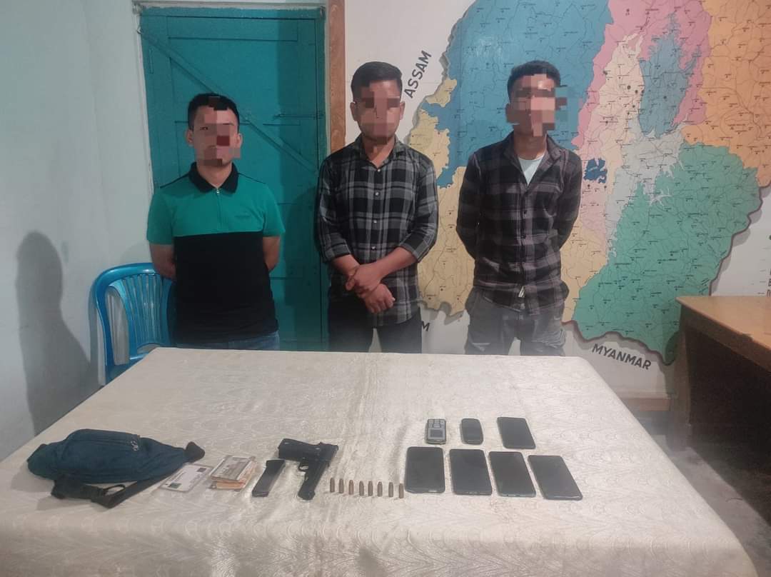 In its press release, the Police Control Room, Manipur, stated that the three members of UNLF organisation, who were involved in extortion activities, have been arrested by the district police in Imphal West. One pistol with a magazine loaded with 8 rounds, 7 mobile phones and one white gypsy without registration number were also recovered from the arrested persons.